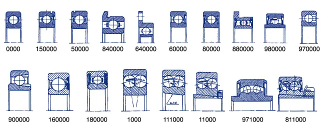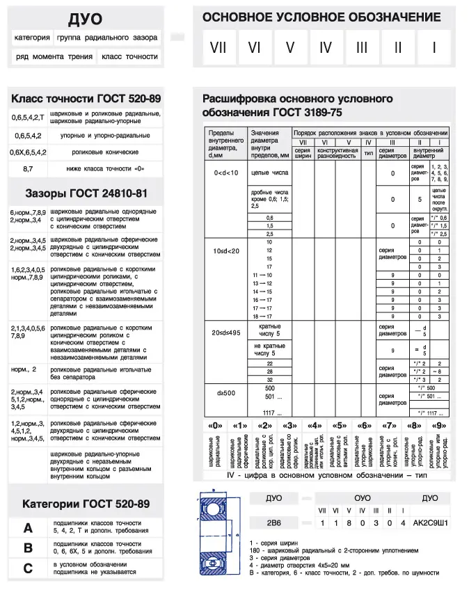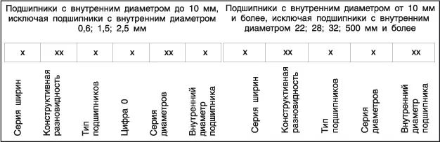 Условное обозначение подшипника наносят на торцы колец клеймением, травлением или электроискровым способом. На наружной поверхности наружного кольца - электрохимическим травлением. Условное обозначение на кольцах не наносят в ряде случаев для миниатюрных и прецизионных подшипников. Его записывают в сопроводительной документации и на упаковке. Условное обозначение подшипников качения состоит из основного условного обозначения и дополнительных знаков. Основное условное обозначение характеризует основное исполнение подшипника: - с кольцами и телами качения из подшипниковой стали ШХ15; - класса точности 0 по ГОСТ 520; - с сепаратором, установленным для основного конструктивного исполнения согласно отраслевой документации. Порядок расположения знаков основного условного обозначения соответствует одной из следующих схем: